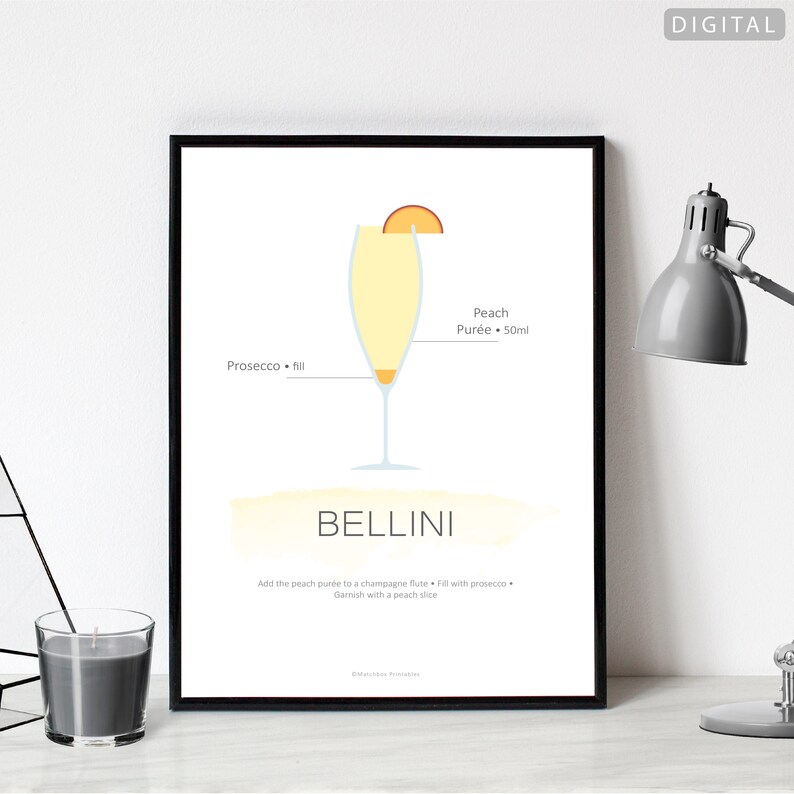Bellini Cocktail Poster Instant Download Cocktail Recipe Print Cocktail Recipe Poster Kitchen Print Kitchen Poster Drinks Poster